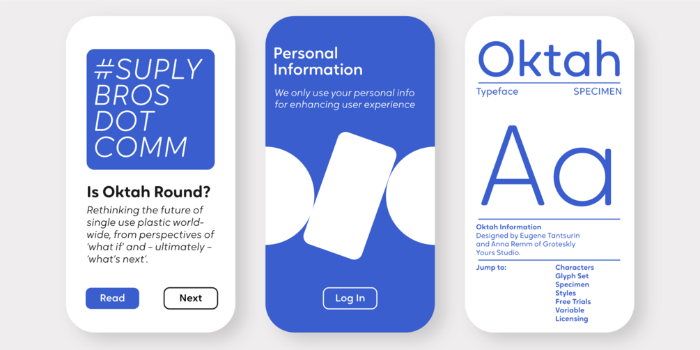 Relying heavily on the geometric forms and proportions first introduced in Oktah, this rounded version does more than just smooth out a few corners. To make curves sharper and more uniform, some terminals were modified. Other visual features (like curving tails in 'l' and 't') were dropped to create more clear cut look. Oktah Round is perfectly balanced and finely tuned to be the font you'd want to use again and again. The variety or styles and availability of a variable font give Oktah Round a potential to be used across multiple mediums.