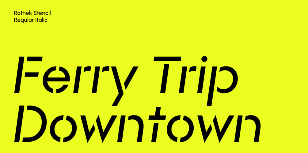 The full Rothek Stencil type family includes 22 static styles (Hairline to Black & matching Italics). The variable font incorporates both axes (Weight and Slant) and can be used for web and graphic design alike. The 22 static styles can be purchased separately or as part of Rothek Stencil.