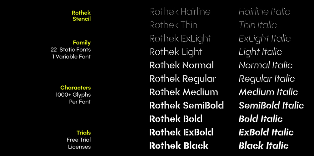 The full Rothek Stencil type family includes 22 static styles (Hairline to Black & matching Italics). The variable font incorporates both axes (Weight and Slant) and can be used for web and graphic design alike. The 22 static styles can be purchased separately or as part of Rothek Stencil.